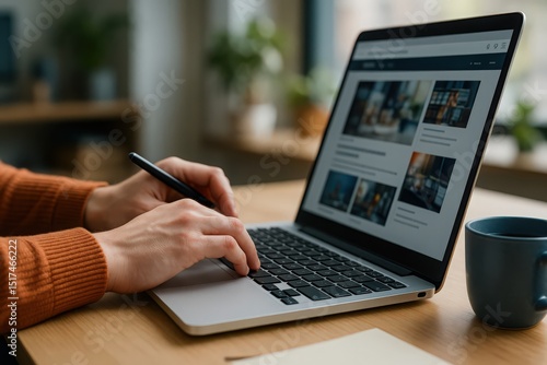 Close-up view of a person working on a laptop at a desk with a cup of coffee and natural light.