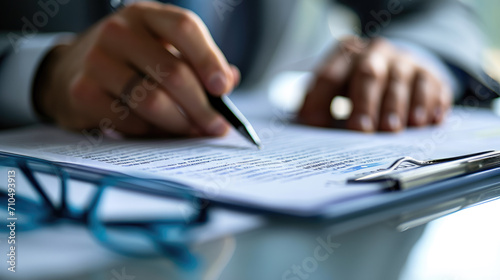 Close-up view of a person's hand holding a pen over a pile of paperwork, indicating they are working, signing documents, or reviewing files.