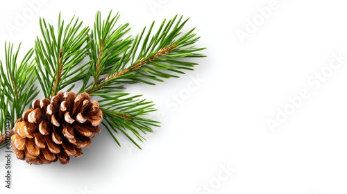 Close-up view of a pine tree branch featuring a pine cone, showcasing intricate details in a hyperrealistic style with expansive space for text