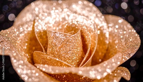 Close-up view of a rose with shimmering gold glitter details, highlighting the intricate texture of the petals.