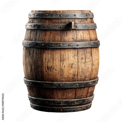 Close-up view of a rustic old wooden barrel with metal bands isolated on black background