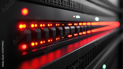 Close-up view of a server rack with illuminated red and green indicators, showcasing technology in action