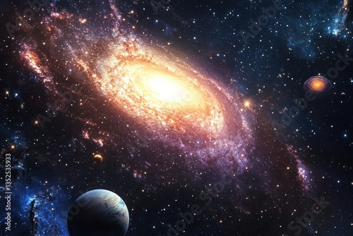 Close-up view of a swirling galaxy with vibrant stars and nearby planets in high-resolution