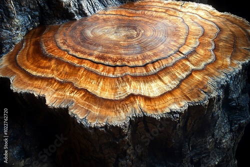 Close-up view of a tree trunk's cross-section, revealing the concentric rings of growth.