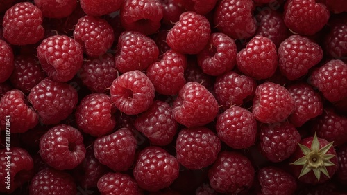 Close-up view of a vibrant collection of ripe raspberries, showcasing their deep red color and textured skin.