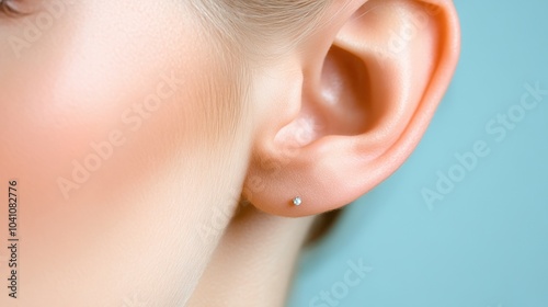 Close-up view of a woman's ear with a stylish earring, soft focus background.