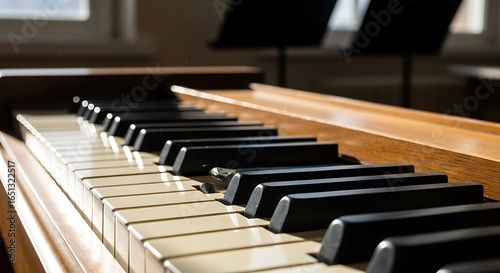 Close-up view of a wooden harpsichord keyboard with black and white keys, suggesting a musical performance or practice session.