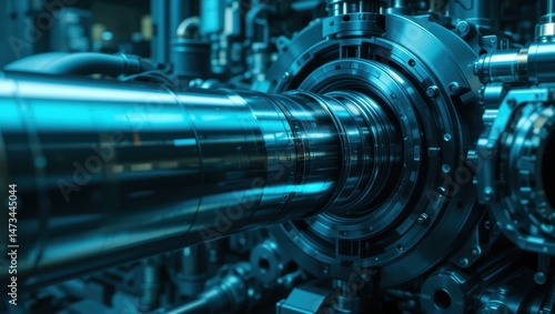 Close-Up View of Advanced Industrial Machinery Components with Blue Lighting and Precision Engineering