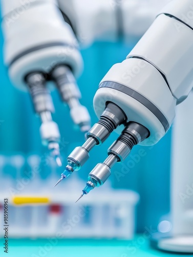 Close-up view of advanced pipetting robots handling multiple syringes, showcasing the precision and efficiency of automation in modern laboratories. This image symbolizes innovation, technology, resea