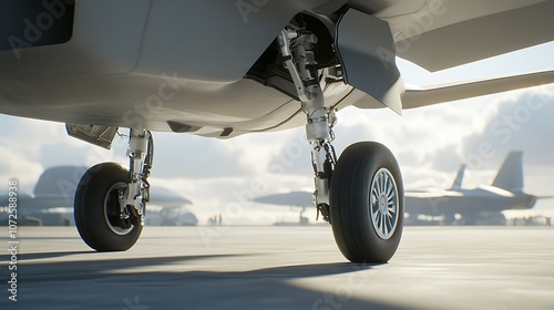 Close-up view of aircraft landing gear on a runway with other planes in the background.