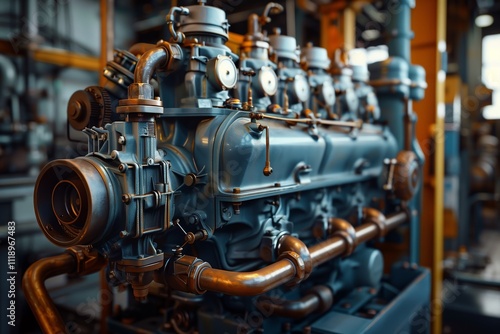 Close-up view of an intricate industrial engine showcasing detailed mechanics.