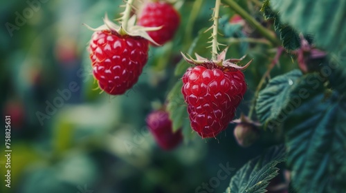 Close-up view of an overripe raspberry hanging from a lush green bush, showcasing the vibrant color and texture of the berry