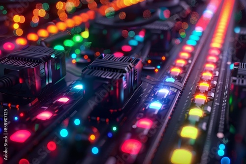 Close-up view of colorful LED lights and circuit boards in a modern data center, showcasing vibrant technology and advanced electronics.