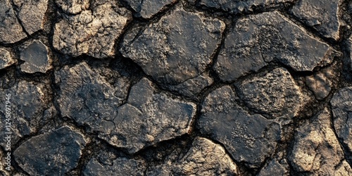 Close-up view of cracked stone pavement texture showcasing dark earthy tones with intricate details and varying shades of brown and gray.