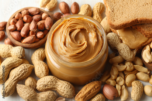 Close-Up View of Creamy Peanut Butter in Jar Surrounded by Nuts and Bread on White Countertop