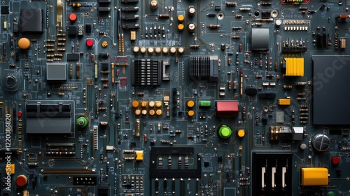 Close-Up View of Electronic Circuit Board Components with Resistors, Capacitors, and Microchips on a Complex Background of Integrated Technology