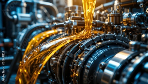 Close-Up View of Engine Components with Flowing Orange Liquid