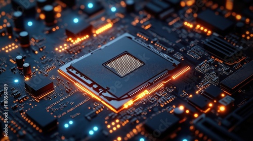 Closeup view of high-tech electronic circuit board. Glowing components highlight intricate circuit design. Advanced tech design. Modern tech components illuminated. Circuit board shows details.