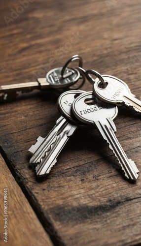 Close-up View of House Keys Resting on a Rustic Wooden Table. Generative AI