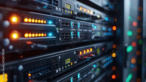 Close-up view of illuminated server racks in a data center with colorful lights in the background
