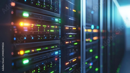 Close-up view of illuminated server racks with colorful network lights and soft depth of field, representing cloud computing and cybersecurity. Perfect for tech branding and IT visuals