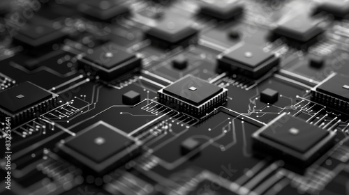 Close-up view of interconnected microchips on a motherboard, showcasing intricate circuit details and modern technology components.