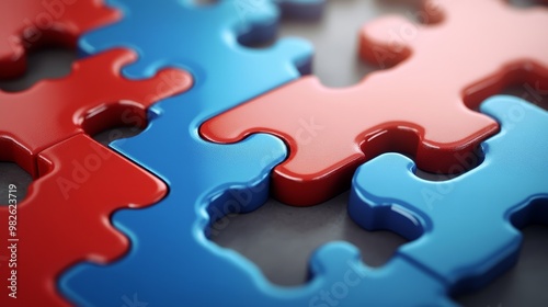 Close-up view of interlocking red and blue puzzle pieces, symbolizing unity, problem-solving, and creativity in design.