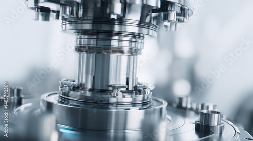 Close-up view of intricate metallic machinery components in a modern industrial setting.
