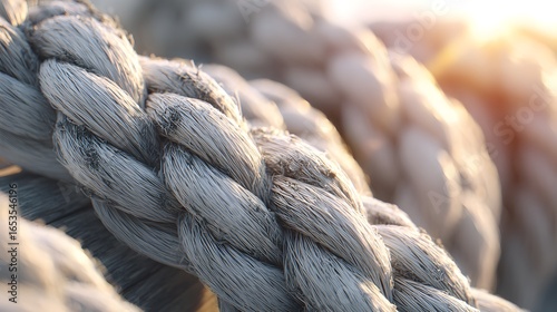 Close-up view of intricate nautical ropes, showcasing the detailed weave and aged texture of the gray-toned fibers.