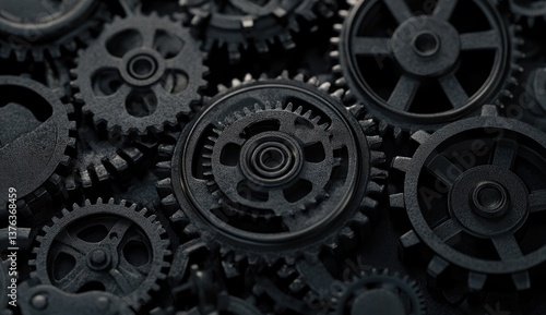 Close-up view of intricate, overlapping gears, exhibiting a complex mechanical system. Dark, metallic, and detailed components suggest precision engineering
