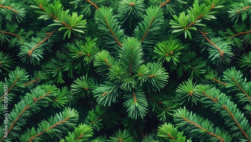 Close-up view of lush evergreen branches with vibrant green needles and subtle reddish-brown accents in a dense natural arrangement