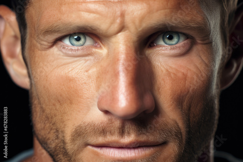 Close-up view of man's face with striking blue eyes. This image can be used to convey emotions, express intensity, or represent captivating gaze. It is suitable for various projects and designs