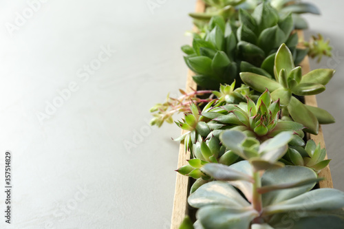 Closeup view of many different echeverias in wooden tray on light grey background, space for text. Succulent plants
