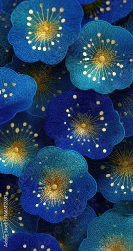 Close-up view of many textured, vibrant blue flowers. Detailed patterns of gold accents radiate from the centers. A multitude of blossoms create a dense, floral tapestry