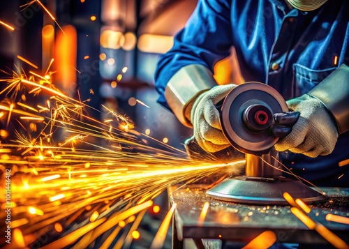 Close-up View of Metal Sanding Process with Sparks and Tools in a Professional Workshop Environment