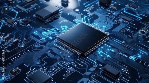 Close-Up View of Microprocessor on Circuit Board with Blue Lights