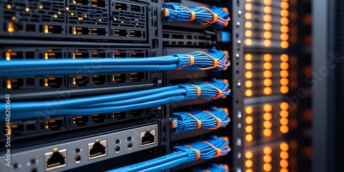Close-up view of network cables connected to data servers with glowing LED indicators, representing internet infrastructure, data management, and high-speed network systems
