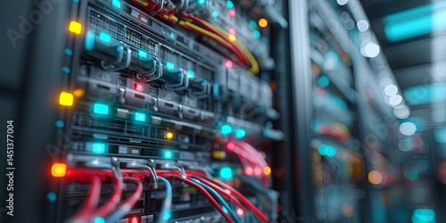 Close-up View of Network Server Rack with Colorful Lights and Connected Cables in a Data Center Environment