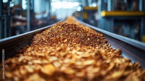 Close-up view of raw biomass materials like wood chips, agricultural waste on conveyor belt system inside processing plant. Conveyor belt transports materials to next processing stage in plant.