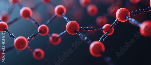 Close-Up View of Red Molecules Connected by Black Chains in a Lab Setting