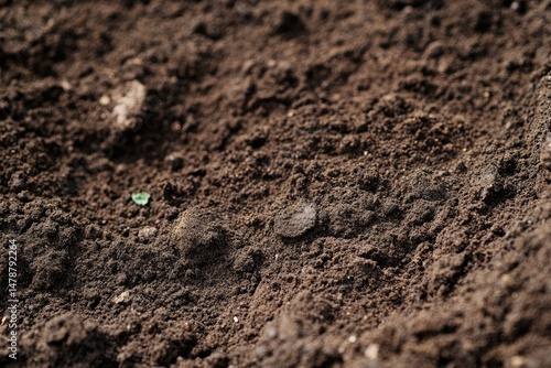 Close-up view of rich, dark soil. A mixture of dirt, small rocks, and organic matter