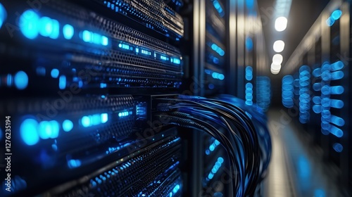 Close-Up View of Server Racks with Blue LED Lights in Data Center Infrastructure for Networking and Information Technology Solutions
