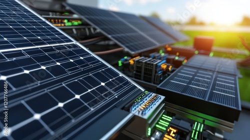 Close-Up View of Solar Panels with Bright Sunlight and Technology Features
