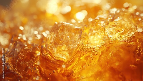 Close-Up View of Sparkling Orange Soda with Ice Cubes and Bubbles Captured in High Detail Under Natural Light