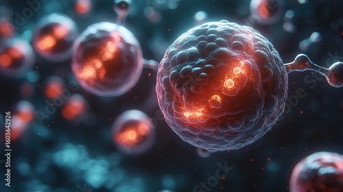 Close-up view of stylized cells with glowing elements, illustrating biological processes.