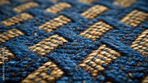 Close-up view of textured, woven fabric with blue and gold threads