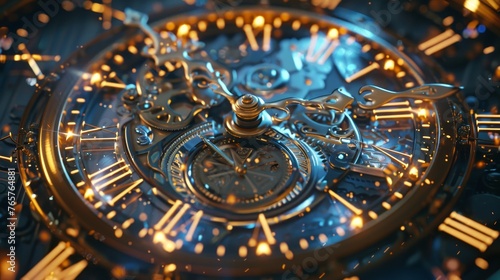 Close-up view of the intricate inner mechanics of a watch, highlighted by a dramatic blue and golden glow.