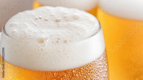 Close-up view of three glasses of light beer, frothy head on top. Crisp, refreshing, and slightly hazy golden-amber color