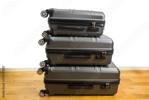 Close-up view of three suitcases on wheels of different sizes on parquet floor in room. Sweden.