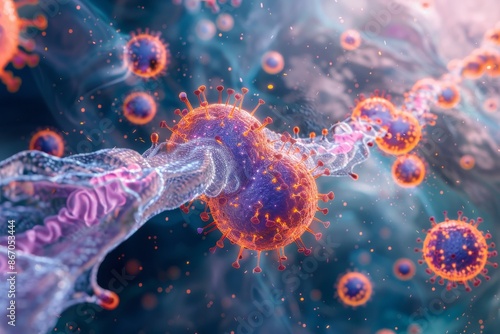 Close-up view of viral particles attaching to and penetrating cells.